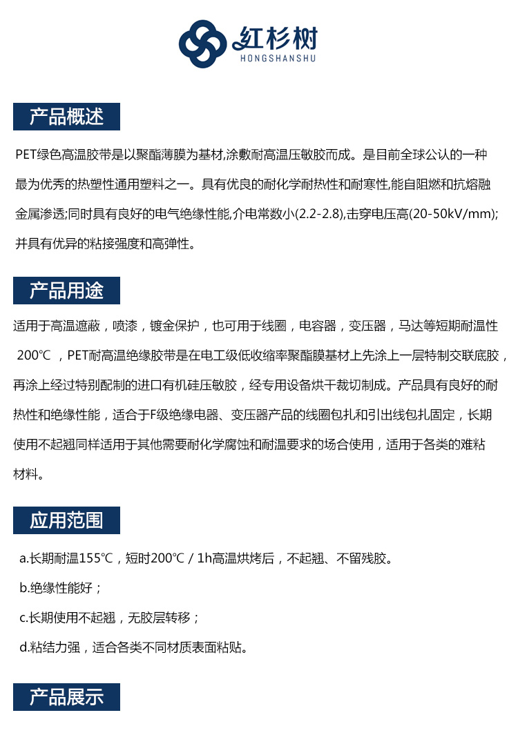 - PET綠色高溫膠帶是以聚酯薄膜為基材,涂敷耐高溫壓敏膠而成。是目前全球公認的一種最為優(yōu)秀的熱塑性通用塑料之一。具有優(yōu)良的耐化學(xué)耐熱性和耐寒性,能自阻燃和抗熔融金屬滲透;同時具有良好的電氣絕緣性能,介電常數(shù)小(2.2-2.8),擊穿電壓高(20-50kV/mm);并具有優(yōu)異的粘接強度和高彈性。