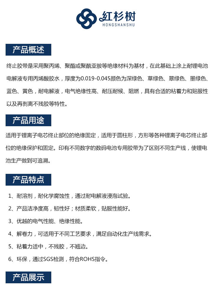 - 終止膠帶是采用聚丙烯、聚酯或聚酰亞胺等絕緣材料為基材,在此基礎(chǔ)上涂上耐鋰電池電解液專用丙烯酸膠水,厚度為0.019-0.045顏色為深綠色、草綠色、翠綠色、墨綠色、藍色、黃色,耐電解液,電氣絕緣性高、耐壓耐候、阻燃,具有合適的粘著力和貼服性以及再剝離不殘膠等特性。
